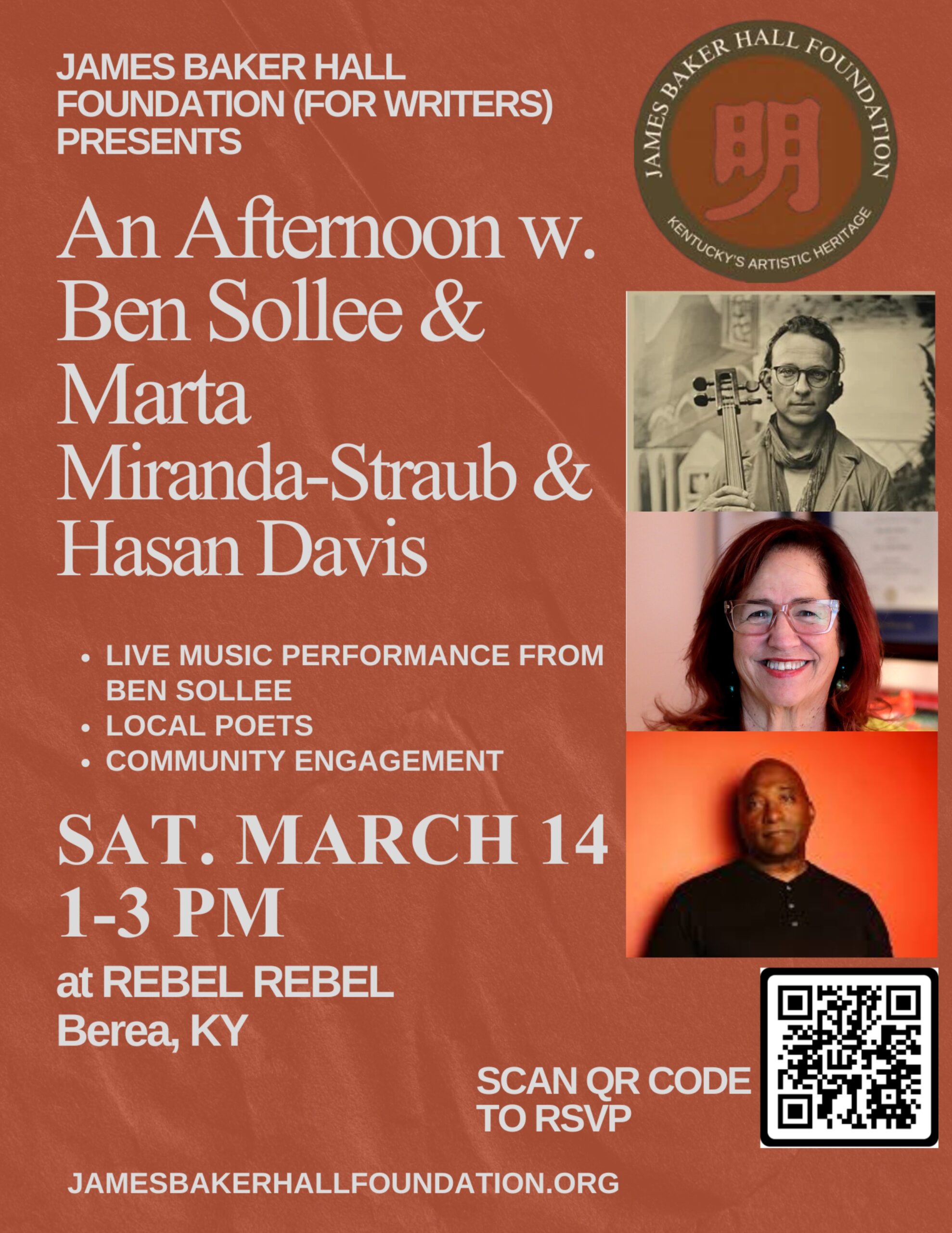 The Foundation is excited to be going to Berea for a first-time visit and we have a dynamic line-up of poets and music. Marta Miranda-Straub, everyoneโs favorite Cubalachian poet, is a published author, poet, storyteller and public speaker. She is the former commissioner for Kentucky’s Department of Community Based Services (DCBS), and she will be the featured poet at the event.